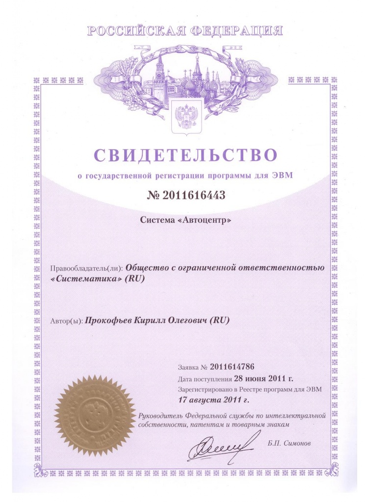 Свидетельство в РосПатентеНеся в себе стандарты процессов дилерских предприятий и мировых производителей автомобилей, система «Автоцентр» получила официальную регистрацию в Роспатенте Российской Федерации